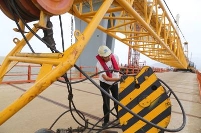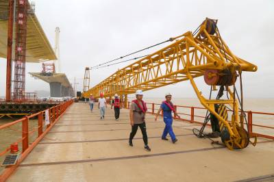 “施工现场受台风影响各广告标识及警示标语损坏严重,现场风力阵风6-8级,为确保现场人员安全,各作业班组禁止一切临边、高空作业,未经专业电工许可禁止合闸送电”。这是7月3日上午9时,中铁大桥局珠机城际金海大桥项目部钢梁架设现场工作群里的一条通知。