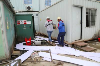 7月3日,台风“暹芭”有所减弱,项目部立即组织安全、机械、电工、物资等相关管理人员到现场进行检查,并积极开展灾后自救工作,尽快恢复生产,把台风造成的损失降到最低。