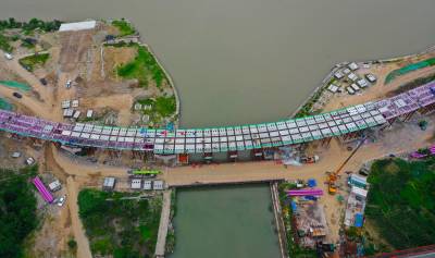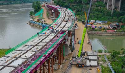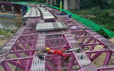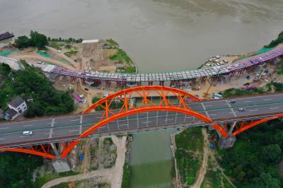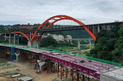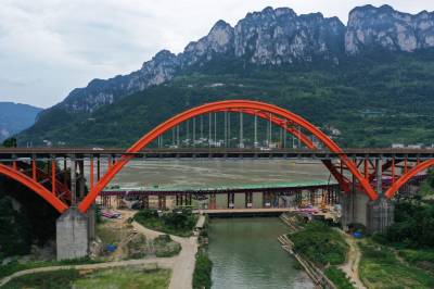 7月4日宜昌市夷陵区境内的348国道三峡旅游公路控制性工程“莲沱大桥”进入桥面铺设攻坚阶段。G348三峡旅游公路莲沱大桥全长285米,位于长江西陵峡畔。