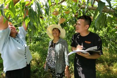 时值油桃、蟠桃成熟季节,来凤县气象局易友(右)在县农园果蔬专业合作社开展“三夏”气象服务。
