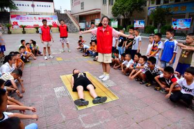 2022年7月11日,湖北医药学院大学生志愿者在教山区农村孩子们“急救知识”。