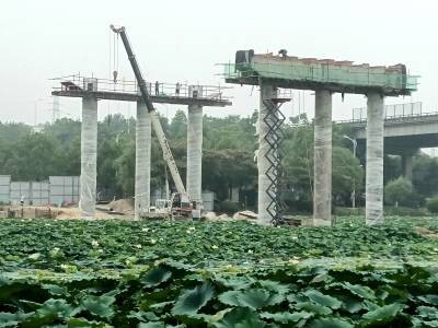 7月12日上午,笔者在G316十堰市武当山段连接线工程项目杨家畈大桥施工现场看到,桥墩已全部浇筑完工,塔吊机正将建筑材料吊运到桥墩顶部,工人们正在进行焊接作业。