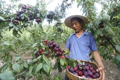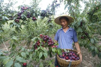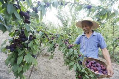 7月13日,竹山县文峰乡塘湾村五组村民杨应义在自家房前果园里采摘“冰糖李”,喜悦溢于言表。