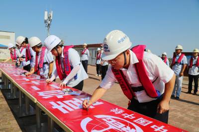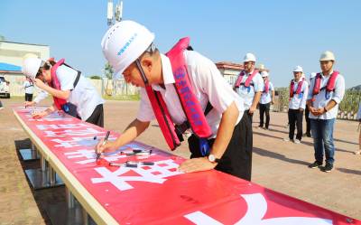 授旗宣誓签名仪式上,中国中铁珠机城际HJZQ-1标项目部总工程师邓永锋将中国中铁“开路先锋”的旗帜,授给中铁大桥局五公司珠机城际金海大桥项目部总工程师李璘琳手中。随后,参加活动的全体员工面对鲜红的“开路先锋”旗帜郑重宣誓:“我是一名中国中铁员工,弘扬‘开路先锋’文化,传承‘开路先锋’精神,争做新时代‘开路先锋’大桥人。我郑重承诺:爱国爱党,诚信守法。忠诚担当,感恩奉献。勤于学习,持续提升。创新创造,业绩突出。团结协作,品德优良。勤俭节约,廉洁自律”。宣誓完毕后,一起在“喜迎二十大,奋进新征程,永远当先锋”横幅上签名。