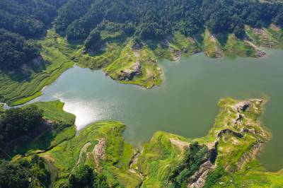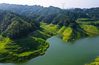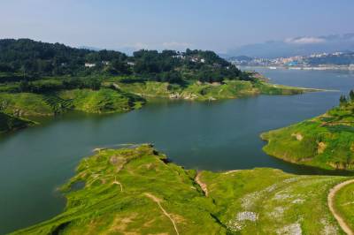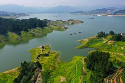 7月26日,宜昌市夷陵区太平溪镇龙潭坪沿江消落带一片葱绿,三峡水库水位从春季的175米腾库下跌至145米后,形成了30米高程的消落带,这些消落带在水退之后自然复绿,循环生态系统形成。