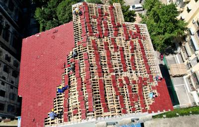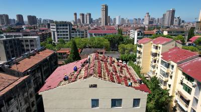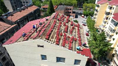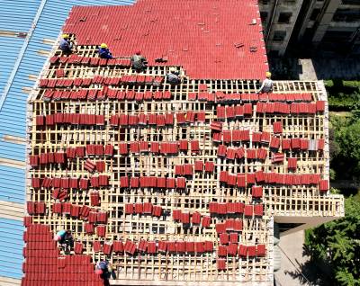2022年8月6日,工人们正冒着高温对宜城市城管局家属院单元楼顶更换新瓦。