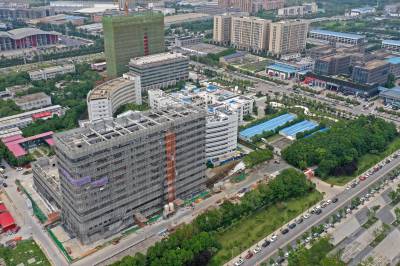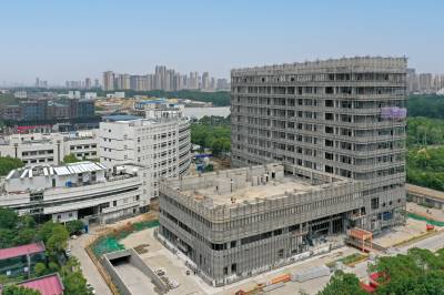 2022年6月9日,武汉市金银潭医院新建的应急病房楼、科研大楼主体结构全部完工。其中新建的应急病房楼项目位于医院内,正进入内外部装修阶段,总建筑面积为3.67万平方米,地上为门诊、医技、负压病房、呼吸道传染病病房,地下为机动车车库和设备用房。为提升重大传染病救治能力,金银潭医院抓住机会补齐短板,大力开展应急病房楼、科研大楼、门诊医技楼及住院部南北楼改造等项目建设,总投资10多亿元。建成后,金银潭医院将具备应急病房、负压病房、P2实验室、P3实验室等应对突发公共卫生事件以及开展各项传染病科研的先进硬件。 (湖北日报全媒记者 倪娜 摄)
