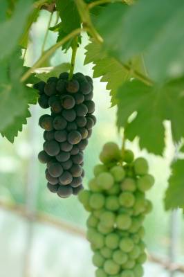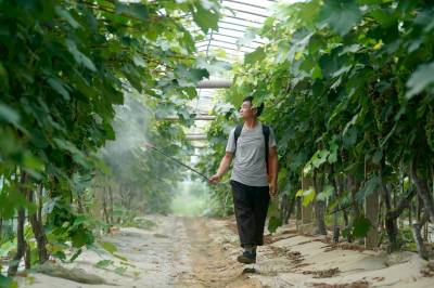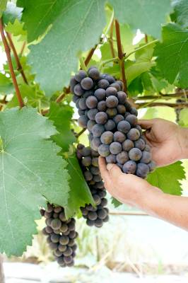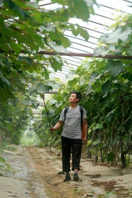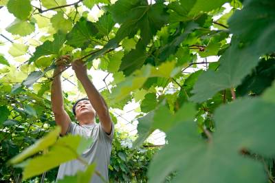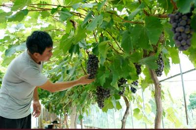 2022年6月22日,东山陈家冲大队,农户朱善良和他的晚夏黑葡萄。(湖北日报全媒记者 倪娜 摄)