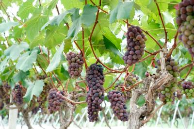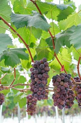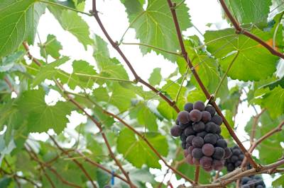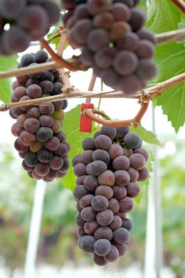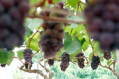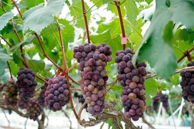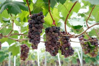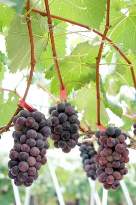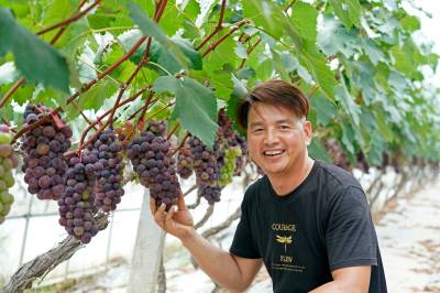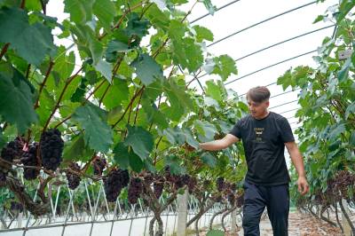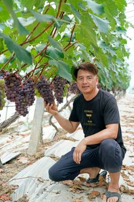 2022年6月22日,在东山陈家冲圣果祥生态园内,张卫兵和他的甬优一号品种葡萄。(湖北日报全媒记者 倪娜 摄)