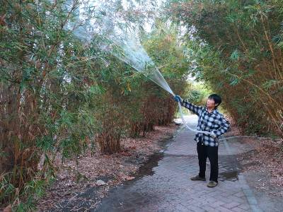 8月19日,竹山县园林部门组织绿化工人在该县城西湿地公园竹林长廊采用抽水方式为园区内竹林等各种绿化树木浇水“解渴”。
