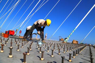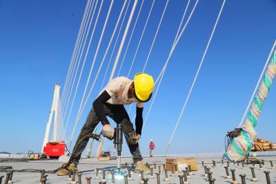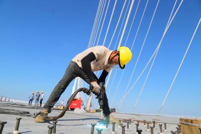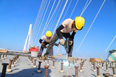 本报珠海讯(通讯员 孟庆虎 江海明) 8月23日,是处暑节气。虽然马上就要出伏,但火辣的太阳仍然炙烤着中铁大桥局珠机城际金海大桥工地,钢箱梁桥面温度高达40度以上,工人们就是在这种高温天气下,头顶骄阳鏖战“秋老虎”,抓紧桥面剪力钉施工,确保每人每天焊接剪力钉3000个的目标。