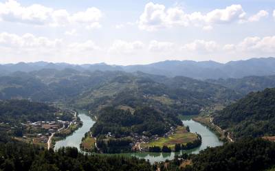 8月19日,蓝天白云下,咸丰县清坪镇龙潭司村一栋栋民居掩映在绿水青山之间。
