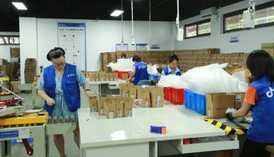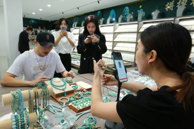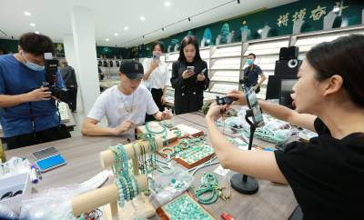 8月31日,竹山县莲花国际绿松石城抖音基地销售厅,员工正在用抖音推销绿松石产品。该县抖音众创空间是创新+创意、线上+线下、孵化+投资的结合,为初创业的绿松石电商、微商企业和抖音直播搭建平台,提供人才培养、众创空间、资金周转支持等服务,据悉,目前已有700多个创业团队入驻,去年以来,该基地已累计销售190余万单,产值近十亿元。