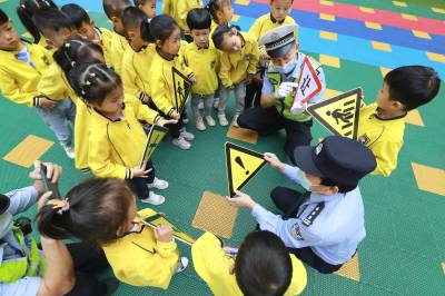 “小朋友,过马路,守纪律,懂礼貌。不插队,不吵闹,不玩耍,不乱跑。认真看,红灯停,绿灯行,黄灯停一停。乘坐两轮摩托车时,一定要戴好安全头盔。”……为做好学生交通安全教育工作,进一步增强学生的交通安全意识和自我防护意识,9月1日开学第一天,湖北省竹山县公安局交警二中队和宝丰派出所民警走进宝丰镇贝儿幼儿园,对孩子们进行交通安全知识教育,把交通安全知识带进校园,掀起新学期校园文明交通安全宣传热潮。