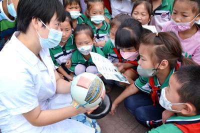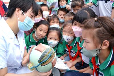 2022年9月15日,眼科医生为小学生讲解“近视防控”知识。
