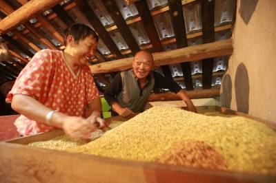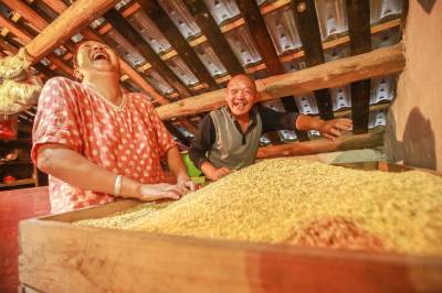 隔壁邻居杜开亭和老伴儿更是笑得合不拢嘴,“屋里今年产2000多斤谷子,一部分卖给合作社,一部分自己留着吃,我们板仓里堆得满满的!”