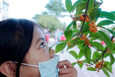 9月29日,十堰市郧阳区杨溪铺镇中学一女生正在观赏品味校园里的桂花花儿及其芳香。