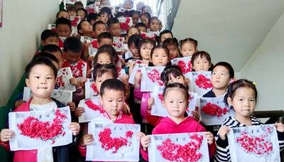 教室内、操场上、活动室里……一幅幅创意无限的照片、一张张阳光灿烂的笑脸、一句句饱含真情的祝福,不论表现形式如何变化,不变的是那一片鲜红和五颗闪亮的星。