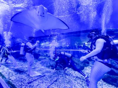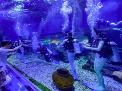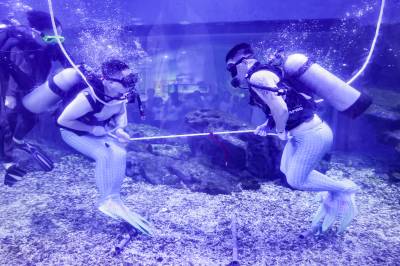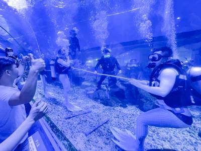 2022年8月20日,在武汉海昌极地海洋公园海底隧道内,决赛选手身着美人鱼服饰在海底拔河一决高下。当日,海合安集团旗下武汉海昌极地海洋公园第二届极地挑战赛进入总决赛“美人鱼拔河比赛”环节。海底隧道内鲨鱼、燕子鳐、龙趸、魟鱼、黑白关刀等上百种近万只各式各样的鱼儿在身旁穿梭,虽然有安全员在一旁守护,但是参赛者还是要克服海水的浮力和鲨鱼时不时凑过来的威慑力。