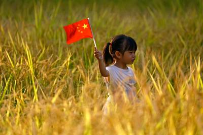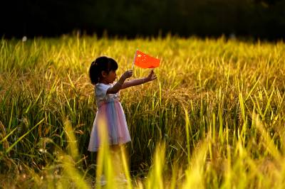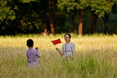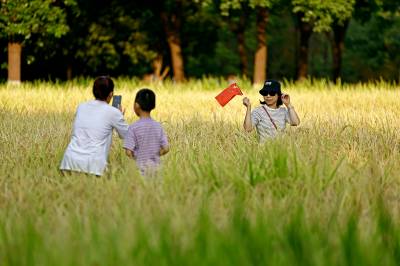 2022年10月1日,市民在稻田内拿着国旗拍照留影。当日,在武汉市东西湖区金银湖街园博园北路杉杉湿地内一片金灿灿的稻田吸引了不少市民前来打卡,与城市稻田亲密接触,感受城市中的田园风光。(湖北日报全媒记者 倪娜 通讯员 熊璨 晏君 摄)