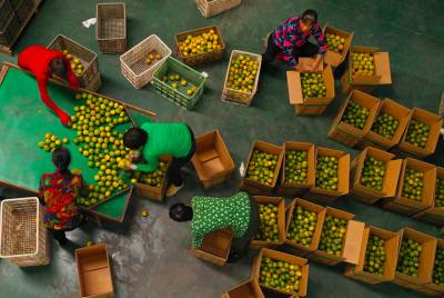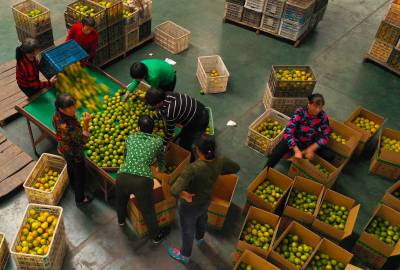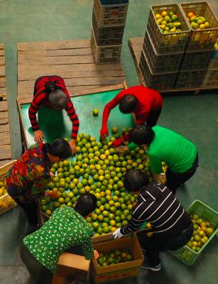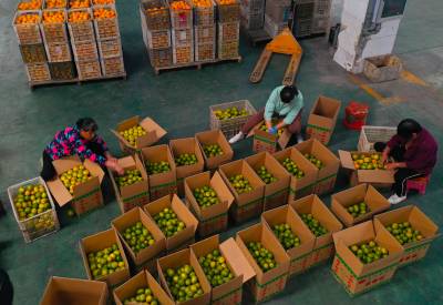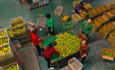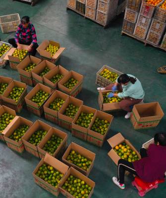 2022年10月9日湖北省宜昌市夷陵区晓溪红柑橘专业合作社车间内,工人忙碌包装日南1号早熟柑橘,当日30吨早熟宜昌蜜桔将出口俄罗斯。