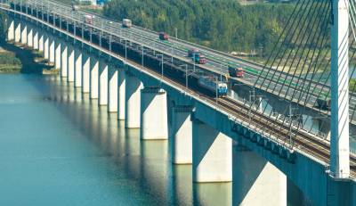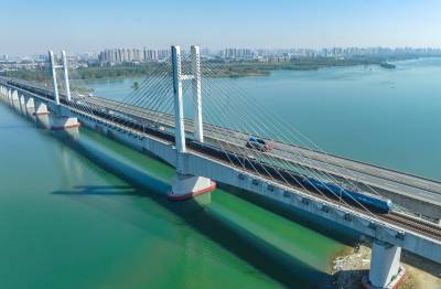10月11日,湖北省襄阳市,一列满载煤炭的货运列车行驶在浩吉铁路汉江特大桥上。