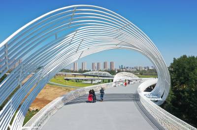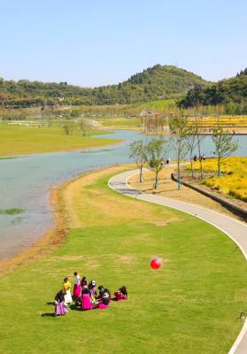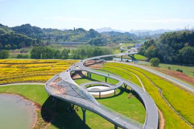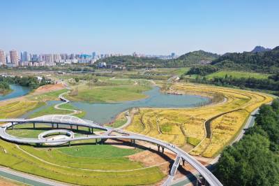 10月11日刚刚建成的宜昌市点军区卷桥河湿地公园迎来大批当地居民和游客慕名前来打卡游玩。