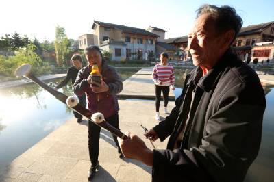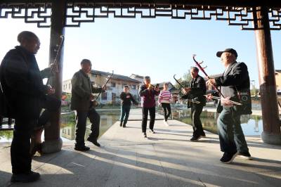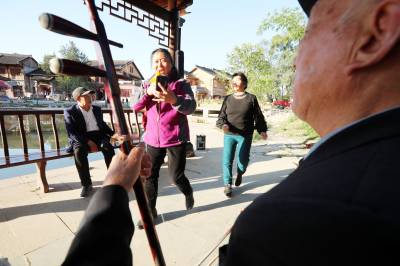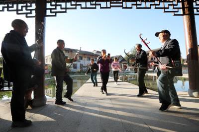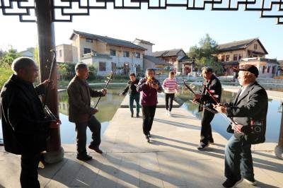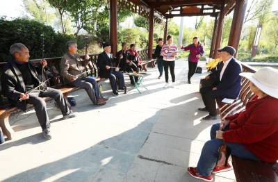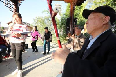 2022年10月12日,十堰市房县军店镇下店子村“夕阳红”演唱队队员在村头的休闲广场拉二胡、唱颂“共产党富民政策好”的自编歌曲。党的二十大胜利召开在既,房县从县城到乡村由市民、村民自发组建的民间乐队、演唱队,自编、自演“产业兴、乡村美、村民富”的十年发展变化歌曲,或唱响红歌进入小区、社区,以歌曲、扭秧歌、乐队独奏等喜闻乐见形式,为广大群众奉送精神“美餐”,激发大家牢记初心感党恩,踔厉奋发喜迎党的二十大胜利召开。
