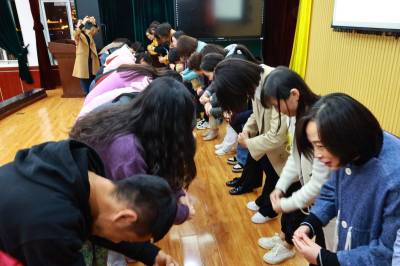 仪式上,徒弟们向师傅行拜师礼,一鞠躬,感恩师傅辛勤指导,无私奉献;二鞠躬,激励自己勤奋努力,认真跟师傅学习教学技艺;三鞠躬,师徒携手共进,为实小教育再创辉煌。