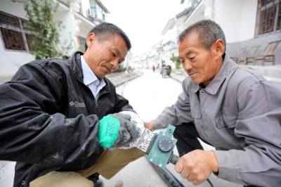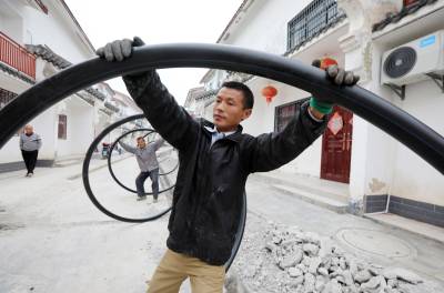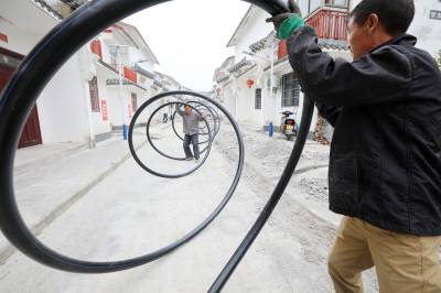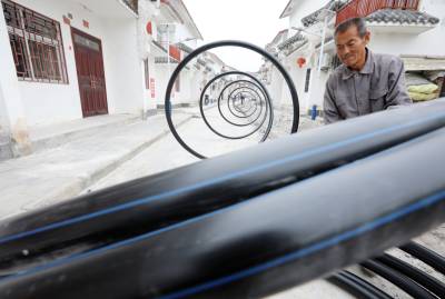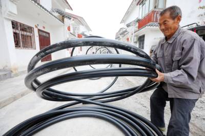 2022年10月14日,水利施工人员在十堰市房县回龙乡园艺小区铺设、安装农村安全饮水巩固提升工程片区入户支水管。近年来,房县全域推进“大水源、大水厂、大管网”的农村安全饮水巩固提升项目建设,织密供水管网,破解干旱涸水期、饮水高峰期、区域人口增量期的农村安全供水不足或暂时缺水的“瓶颈”,让千家万户从有水喝提档升级到喝上“安全放心水”“长流水”,助力乡村振兴,福祉民生。今年以来,完成新建农村安全饮水巩固提升工程15处,铺设、维修供水管网近60千米。目前,该县农村供水规模达6.11万吨/日,全县40.55万农村人口、682个易地搬迁小区实现饮水全覆盖。