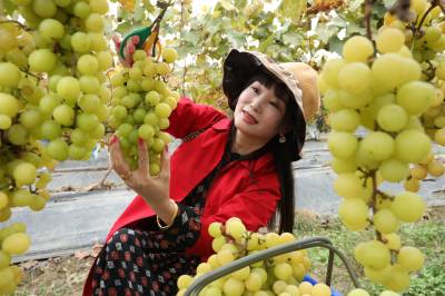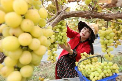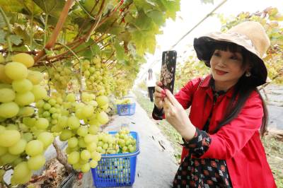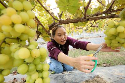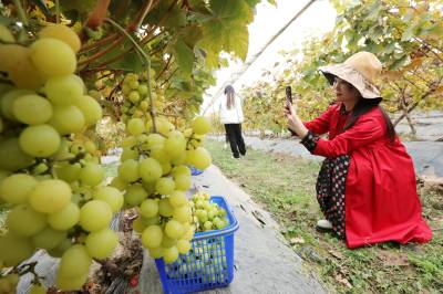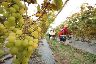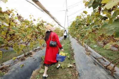 10月15日,十堰市房县化龙堰镇高桥村500多亩连片的葡萄园,由湖北景辰绿色农业有限公司投资开发,当地村民利用土地入股,现己“孵化”成集“春光、阳光、丛林玫瑰”等6个品牌的优质高产葡萄基地,图为游客在园区采摘自购阳光葡萄。近年来,房县化龙堰镇集聚返乡创业人士、本地乡土人才,组建公司、专业合作社与家庭农场,村民通过“资金、土地、农业技术”入股,抱团发展规模特色型葡萄、猕猴桃、黄桃、李子、设施蔬菜等果蔬产业,有效带动农民增收就业。如今,化龙堰镇村民通过产业带动,分红“股金+租金+薪金”,带动农民就地就业1200多人,村民人均年收入翻倍增加。 视界网 张启龙 摄