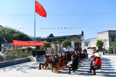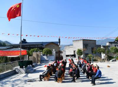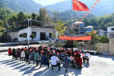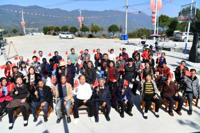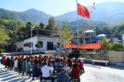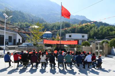 2022年10月16日,湖北省咸宁市通城县关刀镇道上村万家山屋场,党员群众手舞红旗集中到村广场上,通过电视收看收听党的二十大开幕会实况直播。