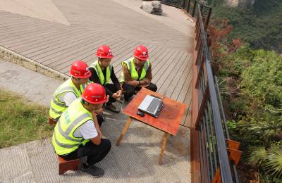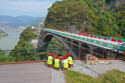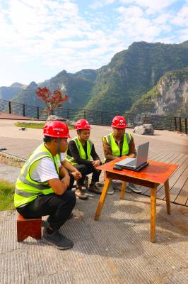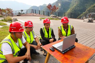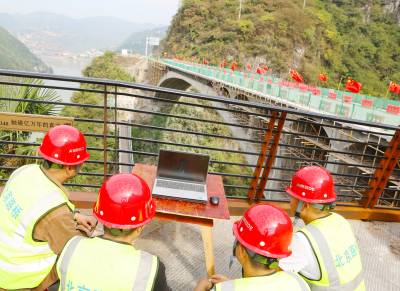 10月16日 宜昌市夷陵区乐天溪镇王家坪村境内的348国道干沟子大桥改造现场,北京路桥瑞通养护公司的4名工人在施工现场利用电脑连接无线信号,观看二十大直播盛况。