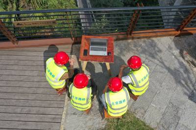 北京路桥瑞通养护中心承担348国道7座大桥的消危改造。目前已经有6座大桥已经相继改造完工,最后一座干沟子大桥10月底工程将全部交付。面对工期紧、任务重的情况,既要赶工程进度,又不耽误党员观看二十大直播。北京路桥瑞通养护中心的党员们针对施工现场离居住地遥远的情况,因陋就简利用建材拼配了一个简易的木桌放置电脑,连上无线信号,锁定二十大直播频道,党员们轮流观看二十大开幕盛况,重点项目施工与学习二十大两不误。