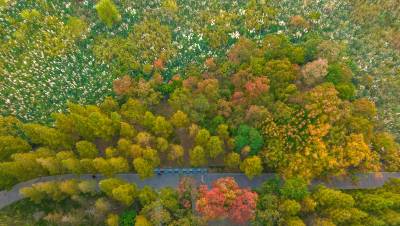 10月17日,襄阳市月亮湾湿地公园秋色斑斓,芦苇花开,美景宜人,人们徜徉在城市氧吧中,锻炼身体、游乐嬉戏,享受大自然的馈赠。
