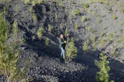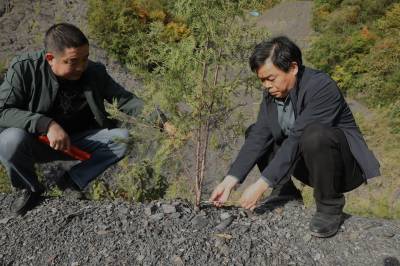 10月17日,竹山县林业局生态保护修复股工作人员到该县秦古镇宝源绿松石矿区复绿现场,查看今年春季栽植侧柏树苗成活率及树苗生长情况,昔日矿山重披新绿。