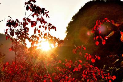 五龙河的红叶树种为黄栌,待到秋天,黄栌叶从山顶向山脚开始逐渐变红,那一树一树的红叶像点燃的野火蔓延,染红了崇山峻岭,也染红了萧索落寞的秋天。唯有那一树树,一片片红叶不畏秋霜洗礼,仍然火热绽放把山野染成鲜红。