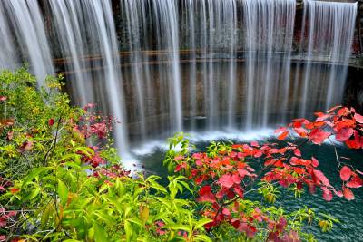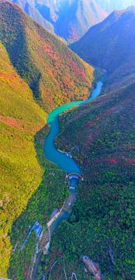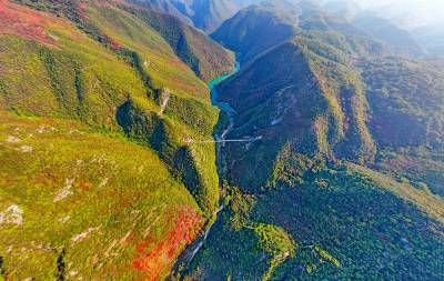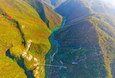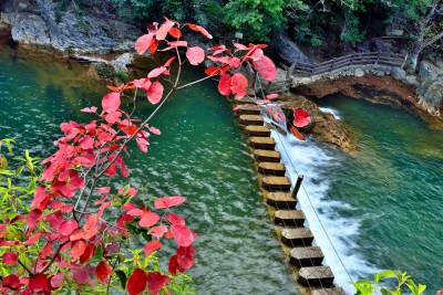 漫山红叶或点缀于冬青翠松之间,或丛生于石阶步道两侧,或悬挂于峭壁悬崖之上。穿梭于林间步道,头顶蓝天,脚踏绿地,昂头观一山红叶,如诗如画;俯首看一河碧水,如醉如痴。让人仿佛置身于人间天堂,好不惬意。