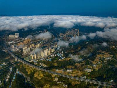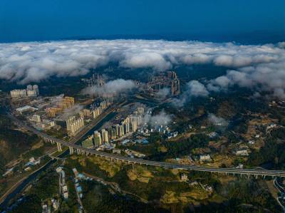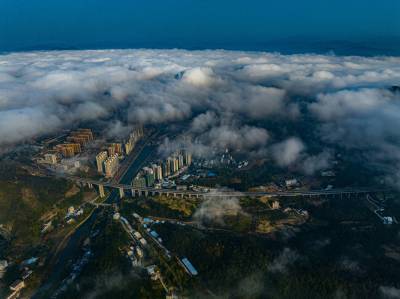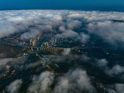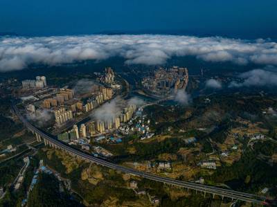 10月23日,襄天高速竹山县城关镇霍山坡高架桥,在晨雾中延伸,美丽壮观(无人机拍摄)。