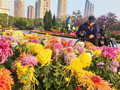 武汉:立冬之晨市民在汉口江滩赏菊花