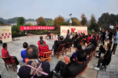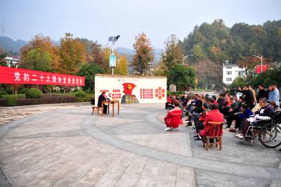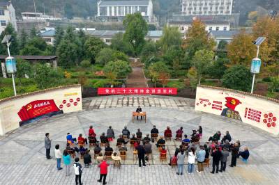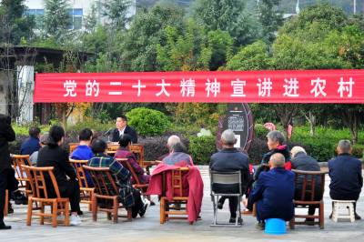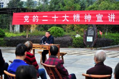 2022年11月10日,宜昌市夷陵区“党的二十大精神宣讲进农村”走进太平溪镇许家冲村,三峡移民群众一起围坐在移民公园,认真聆听党的二十大精神。