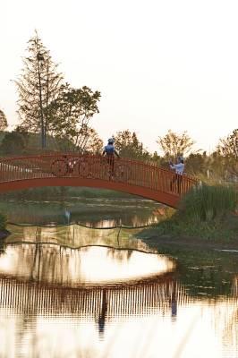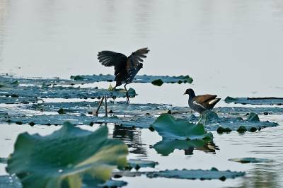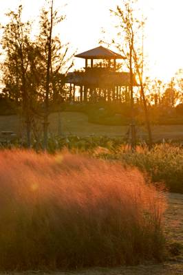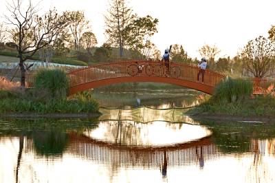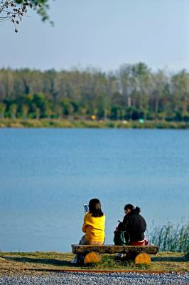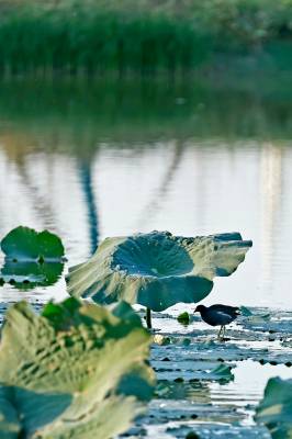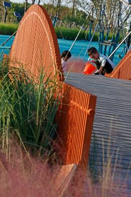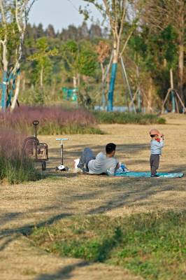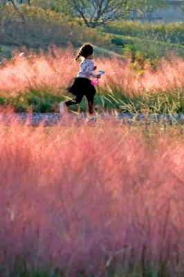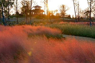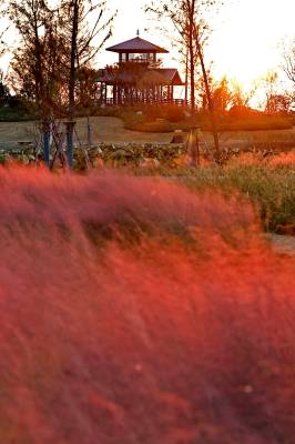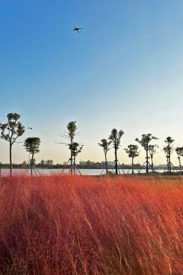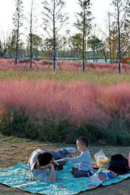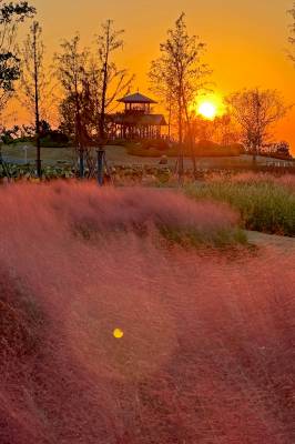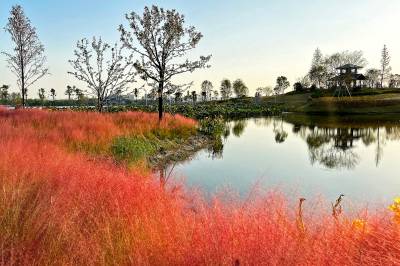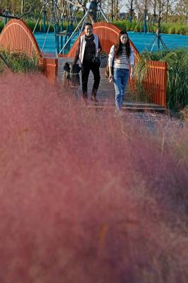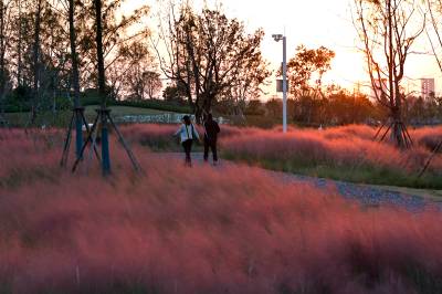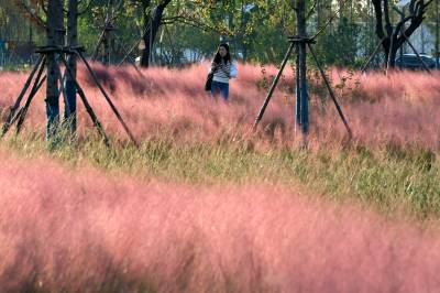 2022年10月14日,武汉市东西湖区杜公湖国家湿地公园粉黛盛开,形成一片浪漫粉色花海。(湖北日报全媒记者 倪娜 摄)