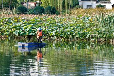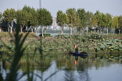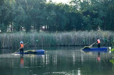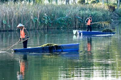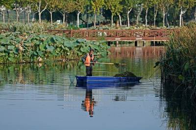 2022年10月18日,在武汉市东西湖区金银湖国家湿地公园内,工作人员划船在湖面上打捞水草。进入秋季以来,公园植被落叶多了起来,再加上湖中保持水质生态平衡的水草长势旺,需要进行清除,以维护水域生态平衡,确保水质。(湖北日报全媒记者 倪娜 通讯员 晏君 摄)