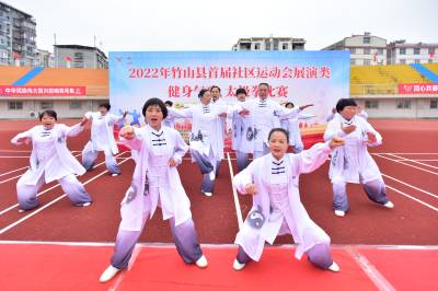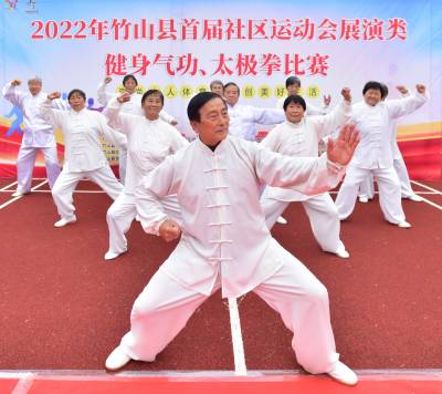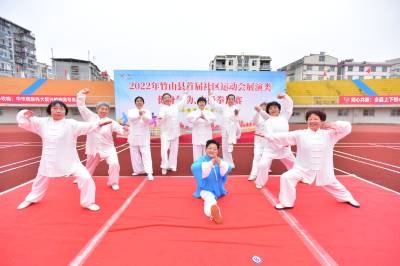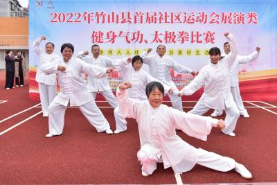 2022年11月16-18日,湖北省十堰市竹山县举行首届“崇尚人人体育,共创美好生活”社区运动会,国家公职人员、在校部分学生及社区群众代表800余人,分别参加了踢毽子、平板支撑、投掷飞镖、射箭、拔河、旱地龙舟、跳绳、武当九式太极拳等中等体力趣味比赛活动,千余居民代表自觉参加坐位体前屈、十字象限跳、绕杆跑、仰卧举腿、掷实心球、曲线托球跑等项目的国家体育锻炼标准测试活动。