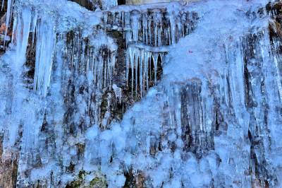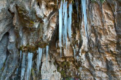 悬崖峭壁上,年复一年日复一日,泉水叮当从未间断,像是神龙的眼泪止不住的流。只是夏天丰水期流速加快,细水长流成线,一到冬天枯水期,泉水滴滴答答,随着温度的降低便会结冰,形成“千仞挂冰凌”的奇特景观。遇到寒冷冬天,冰凌自上而下相连,形成多人合抱粗的冰柱,预示着来年风调雨顺、五谷丰登。可惜,近几年气候变暖,这样的景观难以再现。