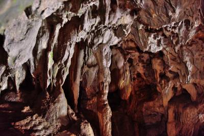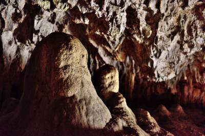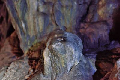 往东10几米,手拉青竹借力攀爬,就到了“有故事”的“神龙洞”,洞口约2米见方,几棵碗口粗的大树把守洞门,从洞口进去令人豁然开朗,置身其中像是步入一间装修豪华的大客厅。吊顶的石笋鳞次栉比、琳琅满目,令人眼花缭乱、目不暇接;地面呈坡状,里高外低,钟乳石地坪凸凹不平;四周石柱林立,有模有样,惟妙惟肖,栩栩如生。洞内有一小洞,深不可测,只能容下一人身临其境,据传可从此洞走到羊尾镇,本村有人持手电筒试投一探究竟,几人结伴探险而行,进入几十米可闻水声、可见水潭,手电筒光亮明显变暗,担惊受怕的探险之旅未能如愿。