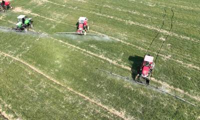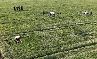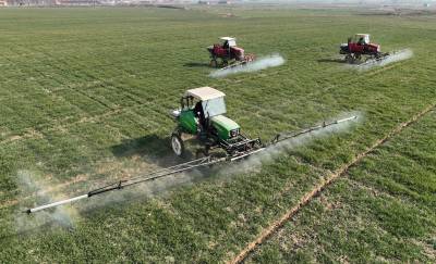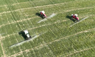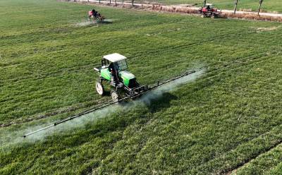 1月30日,襄州区石桥镇马坡村马红伟种植的610多亩小麦地里,农用无人机、地走植保机正在喷施调节剂和叶面肥,以促进小麦返青拔节。由于近期温差大造成小麦、油菜等越冬农作物大面积冻害,襄阳市襄州区组织农技人员深入田间地头指导加强田间管理,截至目前,共出动植保机械500多台套,千余农户参与其中。截至目前,襄州区150多万小麦已普施了小麦返青拔节肥,因地制宜喷施了植物调节剂和叶面肥,后期将在小麦抽穗扬花至灌浆期,结合小麦赤霉病等病虫害防控,全面落实“一喷三防”措施,实现增穗增粒增重,为夏粮丰收打下坚实基础。王虎 任伟摄