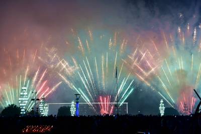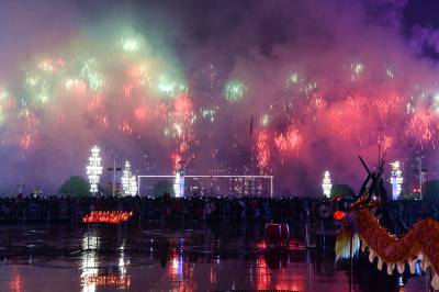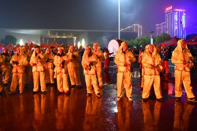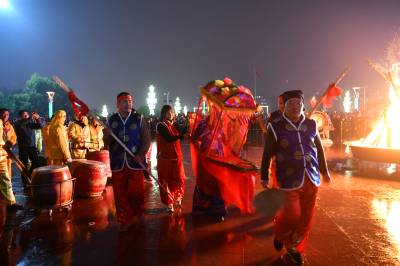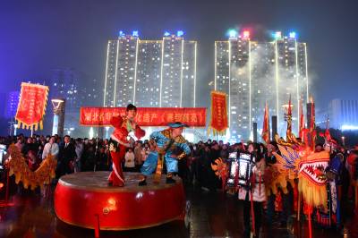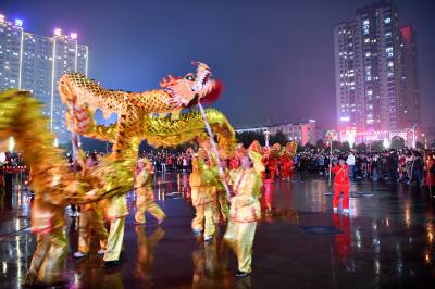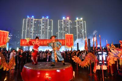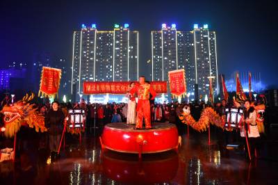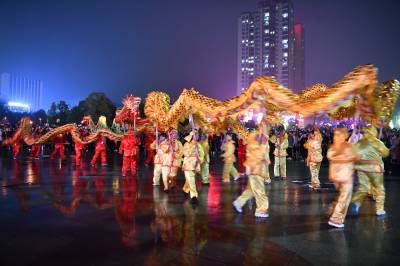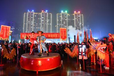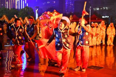 2023年2月5日晚,湖北省咸宁市通城县银山广场,民间艺人在“赛锣赛亮” 元宵灯会上进行锣鼓、采船、舞龙等民俗表演。