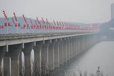 2月4日拍摄的十堰市郧阳区汉江二桥,桥两边挂满了红灯笼,张灯结彩庆元宵。视界网王涛摄