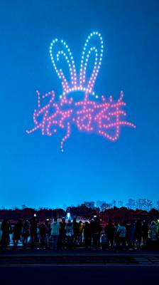 2023年2月3日,武汉市园博园。春节里文化活动丰富多彩,上演的新春无人机秀,年味儿的科技感满满,300架无人机以云梦湖夜空为幕布,以光为笔,璀璨灯光吸引众多市民观赏。